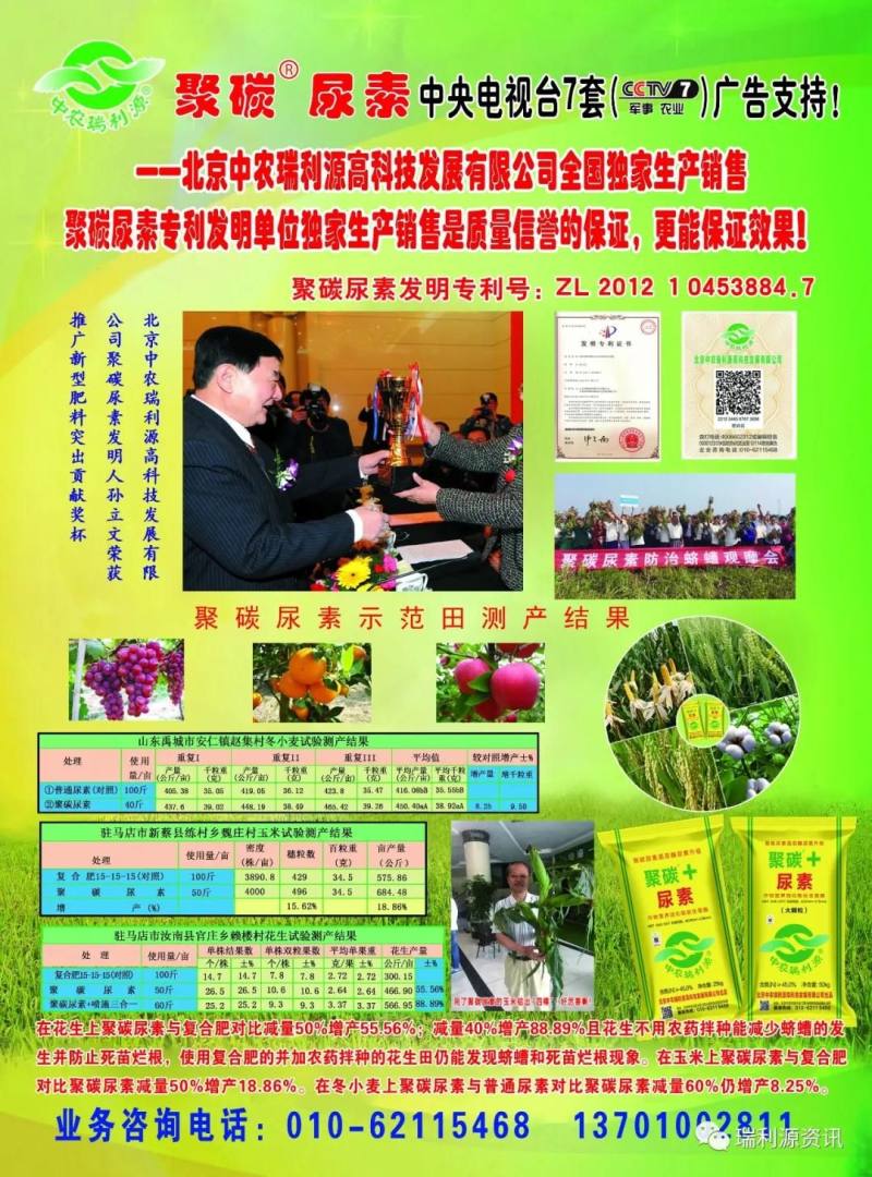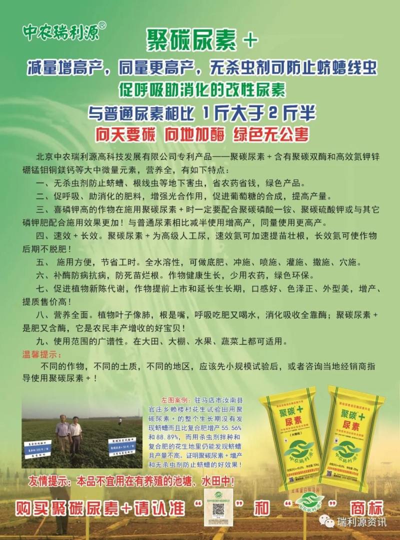 特别提醒在施用聚碳系列肥特别是《聚碳尿素+》时要特别注意使用方法和时间,不同的作物,不同的土质,不同的地区,应该先小规模试验后,或者咨询当地的零售商指导使用《聚碳尿素+》!因为《聚碳尿素+》含有缩二脲,使用不当会对作物造成伤害!对于喜磷钾作物,一定要配合磷钾肥施用!