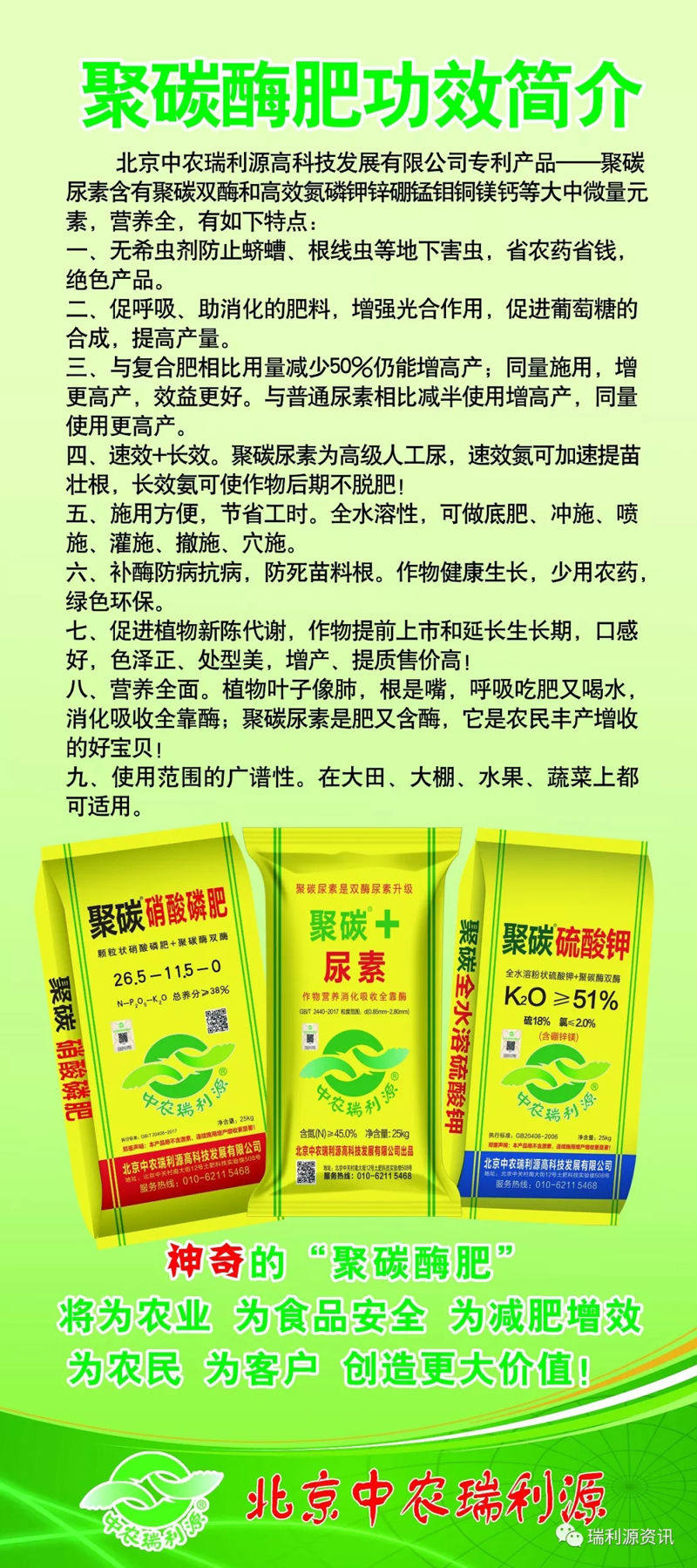 孙立文教授表示聚碳系列产品所说的“聚碳”,就是“向天要碳”,是通过“聚碳酶”聚集空气中的二氧化碳,帮助叶片从空气中吸收大量二氧化碳合成大量葡萄糖,解决作物生长所需的第一大元素“碳”元素,提高光合效率,增加作物养分积累,促进农产品成熟,增加产量,品质提升着色。“向地加酶”就是向土壤增加帮助消化吸收的“酶”,提高化肥利用率,催化生化反应,防治生理病害,消除因大量施肥或农药的使用造成对土壤的破坏。通过酶的作用,帮助植物吸收消化体内多余的铵根离子和硝酸根离子,降低化肥在植物体内的残留,生产出绿色农产品。